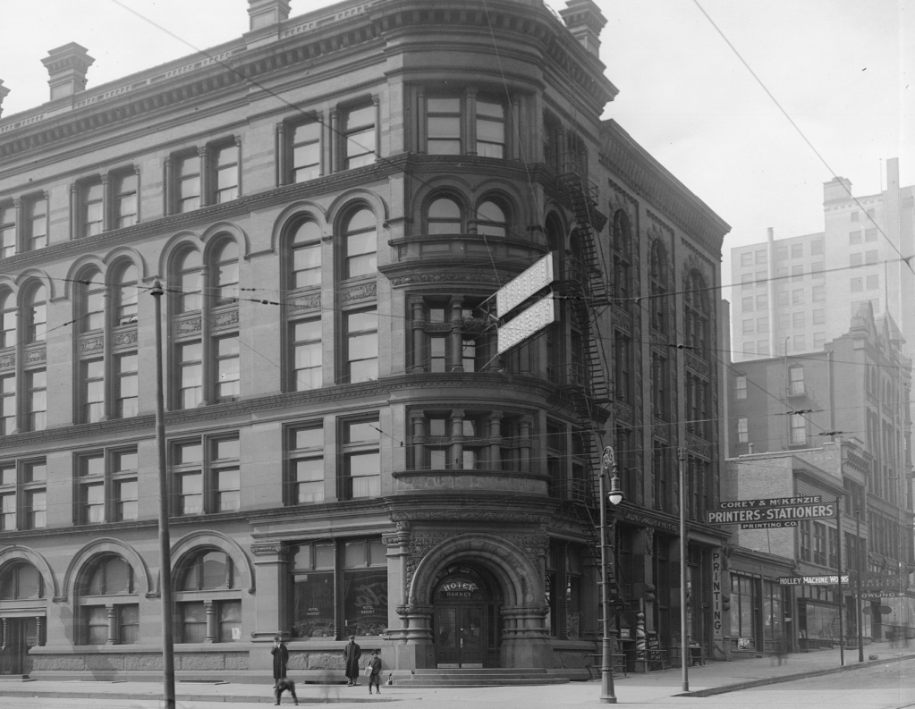The storefront was modernized in 1949, and at some point, the spandrel panels and cornice on the eastern half of the building were removed. When the Hotel Harney was demolished in 1965, it exposed long-hidden advertisements on the eastern wall of the building. One read: “Meyer & Raapke, Western Distributing Agt’s for Blackwell’s The Only Genuine Durham Tobacco,” and the other: “Marks Bro’s Saddlery. Wholesale Manufacturers. Saddles, Harness and Collars.” The advertisements were later painted over to protect them from deterioration.