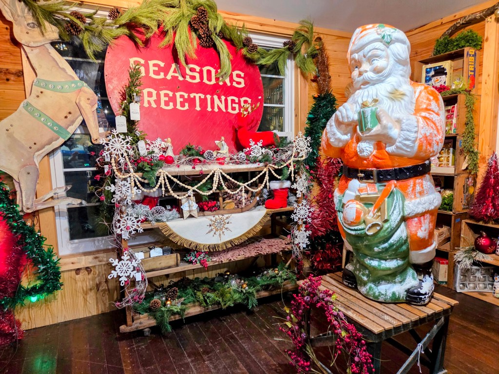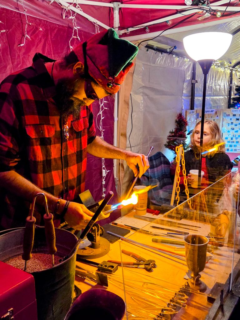 Spread across 80-acres, you will follow a path that is lit up with lights and lined with local and regional vendors housed in 20 or so trailers/cabins. The small shops offer plenty of gift ideas ranging from holiday decor to toys, candles, jewelry, vintage clothing, books, records, candy and live ornament glass blowing.