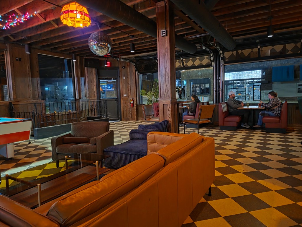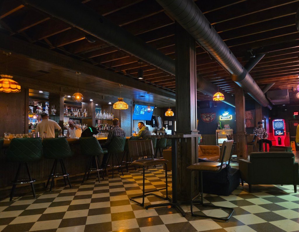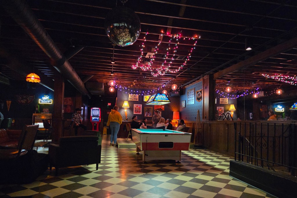 The decor inside the popular neighborhood bar offers an eclectic retro vibe with garage doors facing Leavenworth – a nice touch for a bar that doesn’t have an outdoor patio. For entertainment, you’ll find a pool table, dart boards and a few televisions. The variety of furniture fits the vibe with everything form cozy booths, high tops, seating at the bar, chairs and couches. The basement serves as a party room.