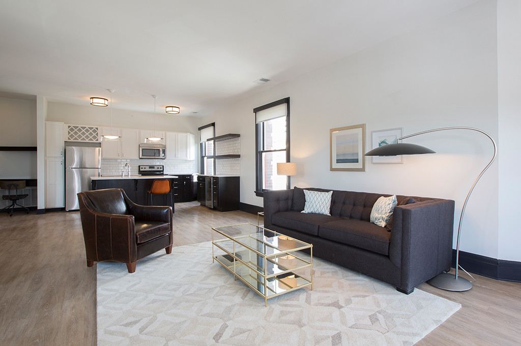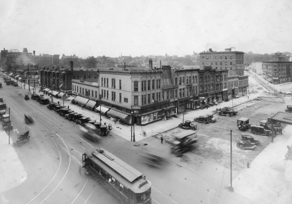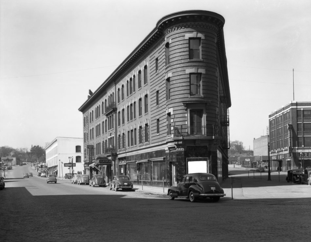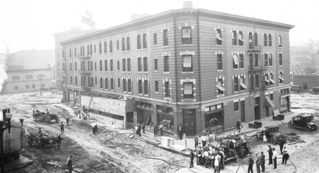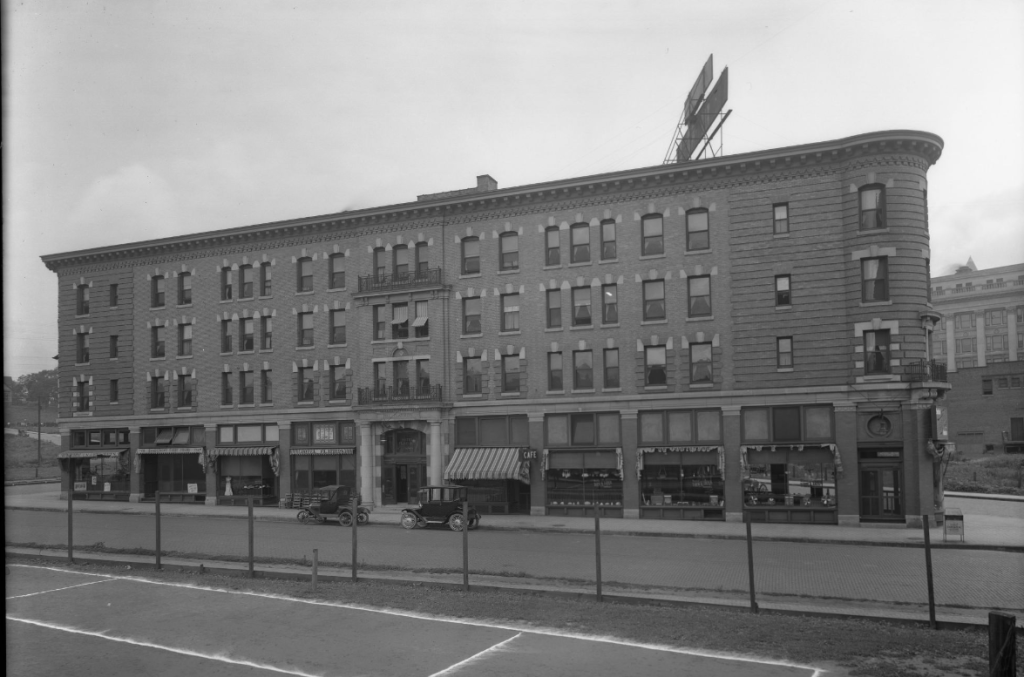 Opening in 1912, the multi-use building at 1722 St. Mary’s Avenue contained ten storefronts on the ground floor, advertised as offering “exceptional opportunities and advantages for high-class retail merchandising.” The upper three floors contained 96 bachelor rooms divided into one-, two-, and three-room suites. Each room was finished in mahogany and included a telephone, hot and cold water, built-in medicine cabinets, and wardrobes, while its 36 restrooms were shared. The main entrance on St. Mary’s Avenue led through a vestibule into a lobby with a tiled floor, service elevator, and steel spiral staircase. At the center of the building was an open-air courtyard.