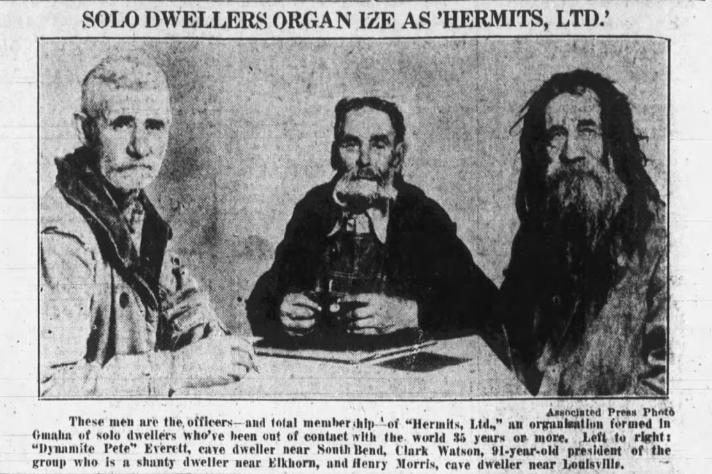 Despite his solitary lifestyle, Pete was no stranger to the city or to publicity. While in Omaha in 1933, he formed a sort of fraternity with other hermits, including Henry Morris of the Platte River and Clark Watson of the Elkhorn River. To become a member of “Hermits Ltd.,” you had to have been a hermit for 35 years and vow to remain one until you died. While Pete couldn’t keep his word, he did outlive the others.