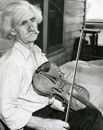 From that point forward, Levi was known as “Dynamite Pete.” After abandoning that line of work, he moved away from the family home in Plattsmouth and took up life as a hermit, living in shacks and caves along Pawnee Creek near South Bend, Nebraska. He lived in the woods, where he fed animals, tended a garden to raise his own food, cured tobacco, and sang and played music on his prized possession—a 200-year-old Jacob Steiner violin his family had brought with them when they emigrated from Germany. Pete claimed to know more than 200 songs.