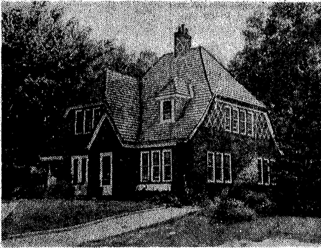 The two-story cottage is the most highly ornamented example of an English Cottage in Field Club. While it conforms to the building standard with its small scale, steeply pitched roof and brick construction, it also features a diapering pattern in the brick work and matching garage as well as the green tile roof and oblong chimney that standout from the norm.
