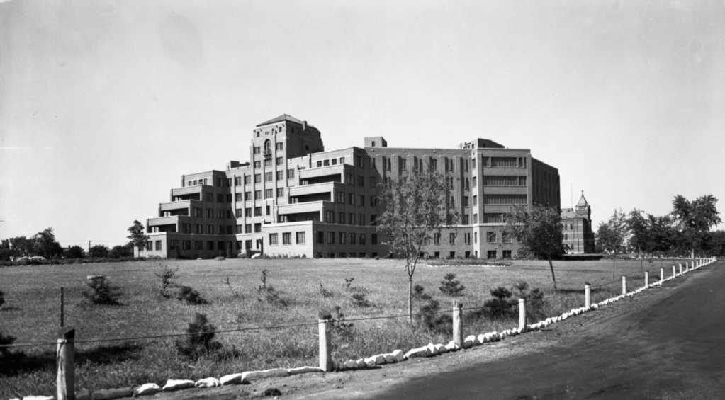 Although the new hospital was larger than the original, only two of the planned three wings were built due to the Great Depression. With 250 beds, one wing treated tuberculosis patients, while the other focused on psychiatric care. The hospital also included space for obstetrics and sick children. Upper floors served as sleeping quarters for physicians and medical residents, while operating rooms, a laboratory, and an X-ray center intended for the third wing were accommodated elsewhere in the building.