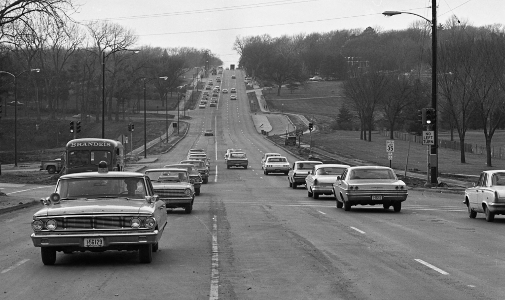 The Dodge Street Overpass ultimately became the fourth pedestrian bridge constructed, as the city coordinated its completion with the widening of Dodge Street to five lanes between 52nd and 72nd Streets. It was during this project that the corridor gained its well-known bidirectional center lane. Beyond safety concerns, Mayor A. V. Sorensen insisted that the bridge be designed as a work of beauty despite budget constraints. Cost overruns were another factor contributing to construction delays.