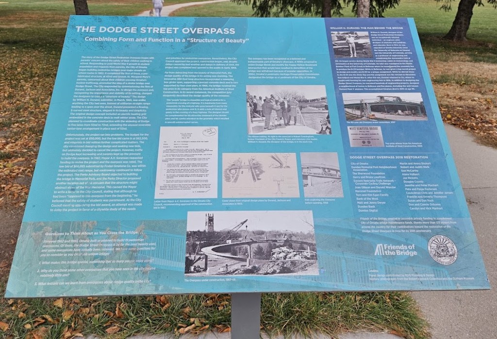 When the Dodge Street Overpass was designated an Omaha Landmark in 2004, its nomination noted that it represented the city’s best effort to combine functionality with style. The bridge was refurbished in 2017, a project that included lead paint removal, repainting, deck resurfacing, base stabilization, and the installation of new historical and landmark signage.