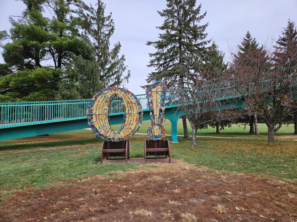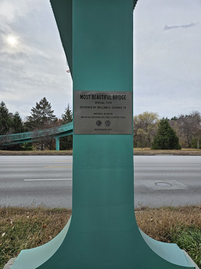When the bridge was completed in 1968, it was unlike anything Omaha had seen before. Its innovative design and distinctive surf green color set it apart, as all other pedestrian bridges in the city were painted brown. In 1969, it was named Most Beautiful Bridge by the American Institute of Steel Construction. A plaque on the north side of the bridge commemorates this honor.