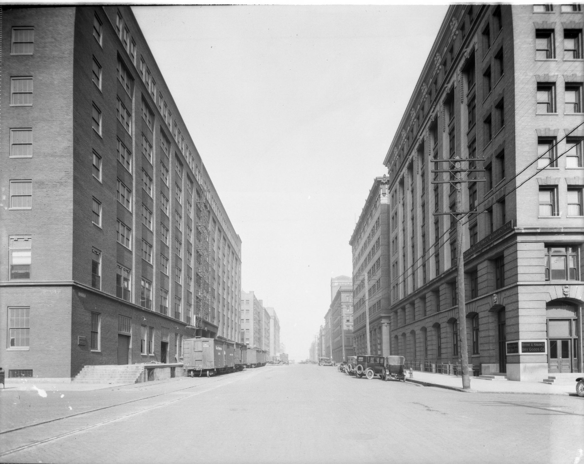 In the area between the river and the train tracks, wholesalers or jobbers that acquired goods from manufacturers via train so that they could be sold to retailers, began to build warehouses. Starting in the 1880s and continuing into the 1920s, they built two dozen buildings in the area that grew into a massive jobbing district. This helped propel the city’s economic growth during its early years.